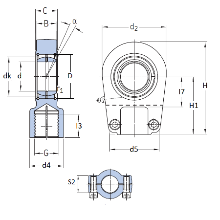 Наконечники штоков с разрезанным хвостовиком подходят для эксплуатации в условиях высоких нагрузок (статических, ударных, переменных). Хвостовик имеет сжимаемую резьбовую часть, затягиваемую болтами. Контактная пара сталь-сталь. Подшипник несъемный. Конструкция относится к необслуживаемым, не требует дополнительного смазывания во время эксплуатации.