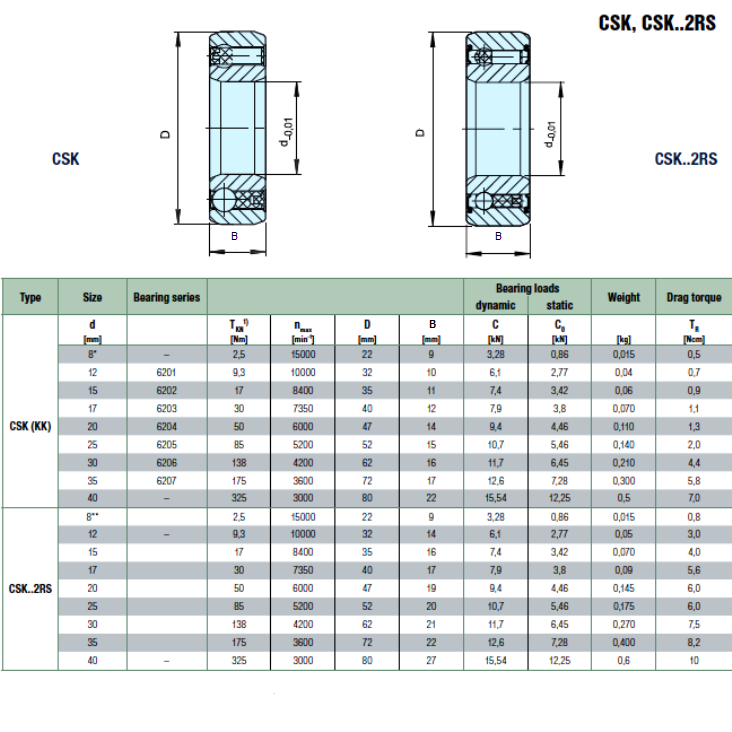 Представленные в разделе обгонные муфты — детали свободного хода, передающие вращение в одном направлении. Для работы узлов могут использоваться шариковые подшипники серии 62. Муфты CSK P, PP являются самоцентрирующимися. Изготавливаются в соответствии с требованиями DIN 6885.3. Могут эксплуатироваться при температурах от −20 до +100 °C. Возможно кратковременное использование при t 120°C. Внешние и внутренние кольца муфт этой серии оснащены шпоночными пазами. В зависимости от типоразмеров, детали выдерживают статистические нагрузки на подшипник от 3,42 до 12,25 кН. Номинальная динамическая грузоподъемность колеблется в пределах от 7,4 до 15,54 кН.