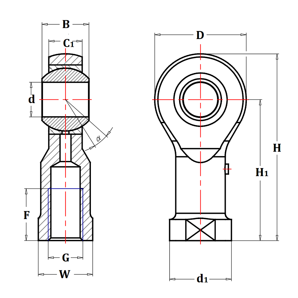 Наконечники штоков с внутренней резьбой возможны с различной комбинацией контактных поверхностей: сталь/сталь, сталь/бронза, сталь/PTFE. Обслуживаемые наконечники штоков с контактными поверхностями сталь/бронза имеют меньшую грузоподъемность, чем наконечники с поверхностями сталь/сталь, но работают лучше в условиях недостаточного смазывания. Необслуживаемые наконечники с комбинацией сталь/спечёный композит бронза с PTFE и сталь/тканевые волокна с PTFE хорошо работают в тяжелых условиях с постояннным направлением вращения